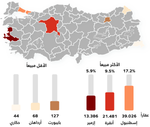 أما المركز الثالث كان من نصيب مدينة إزمير الساحلية السياحية بواقع 13.386 عقاراً، بنسبة 5.9% من إجمالي المبيعات في تركيا.